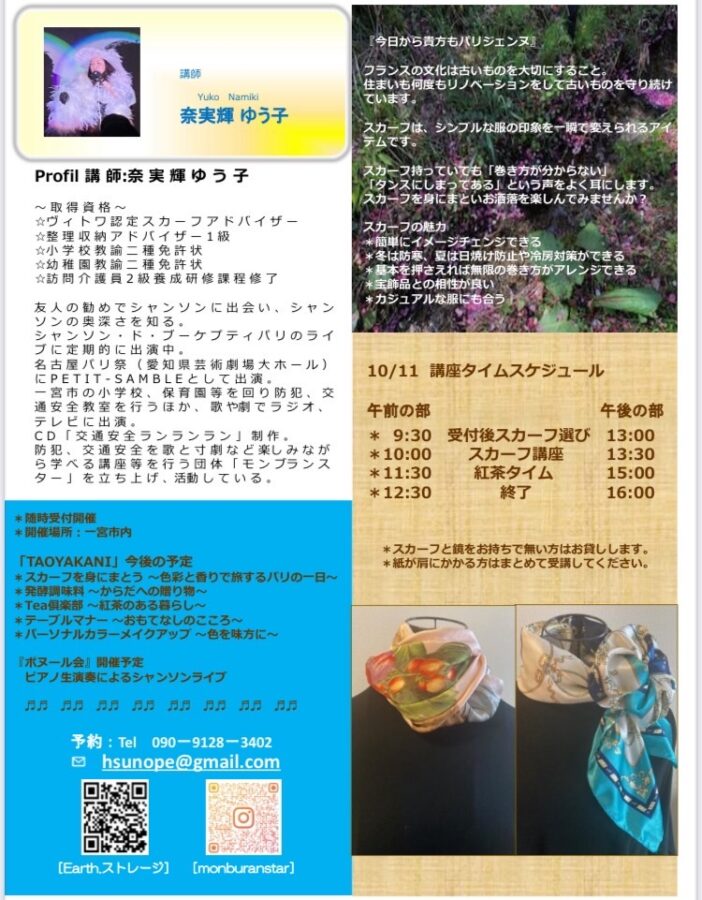 スカーフ講座 2025年10月11日 #敬老会 の後は #スカーフ講座 講座終了後は、 みなさん、キラキラな笑顔になるんです。 #スカーフ という魔法にかけられたみたいに。 これからの季節、ちょっと結び方を 知ると、一枚のスカーフで、色々と着回しできちゃうんです。 ご興味ある方は、是非ぜひ。 #一宮市議会議員うやま祥子 ブログ ツイート シェア はてブ pocket LINE 本日、敬老会 前へ 一覧へ 次へ おすすめ関連記事 休日夜間急病診療所 平日夜間診療休診のお知らせです。 2020年09月23日 第35回すぎと寄席開催しました。 2020年11月22日 尾州生地を使った秋冬素材のスーツはとても暖かく軽く、レオダのスーツ 2020年12月30日 総合展「THE尾州」を2月17〜19日開催いたします。 2021年02月14日