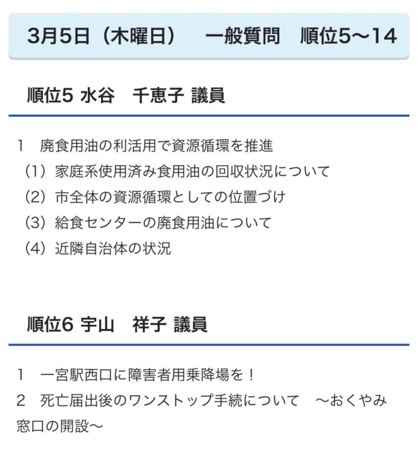 令和8年3月定例会一般質問登壇 2026年03月02日 3月議会一般質問の私の出番は、 3月5日木曜日10時10分頃です。 市役所14階議場傍聴席まで、お出かけください。 YouTube、ICCケーブルテレビ生配信あります。 Screenshot ブログ ツイート シェア はてブ pocket LINE 国府宮はだか祭り 笹奉納させて頂きました。 前へ 一覧へ 次へ おすすめ関連記事 かかりつけでなくても接種して頂ける浅井耳鼻咽喉科さんへ 2021年06月17日 市指定文化財「島文楽人形」「人形の虫干し」開催のお知らせ 2021年07月27日 杉戸浴場の新しい展開 2021年09月12日 がんばれ!藤原のりまさ候補 2021年10月25日